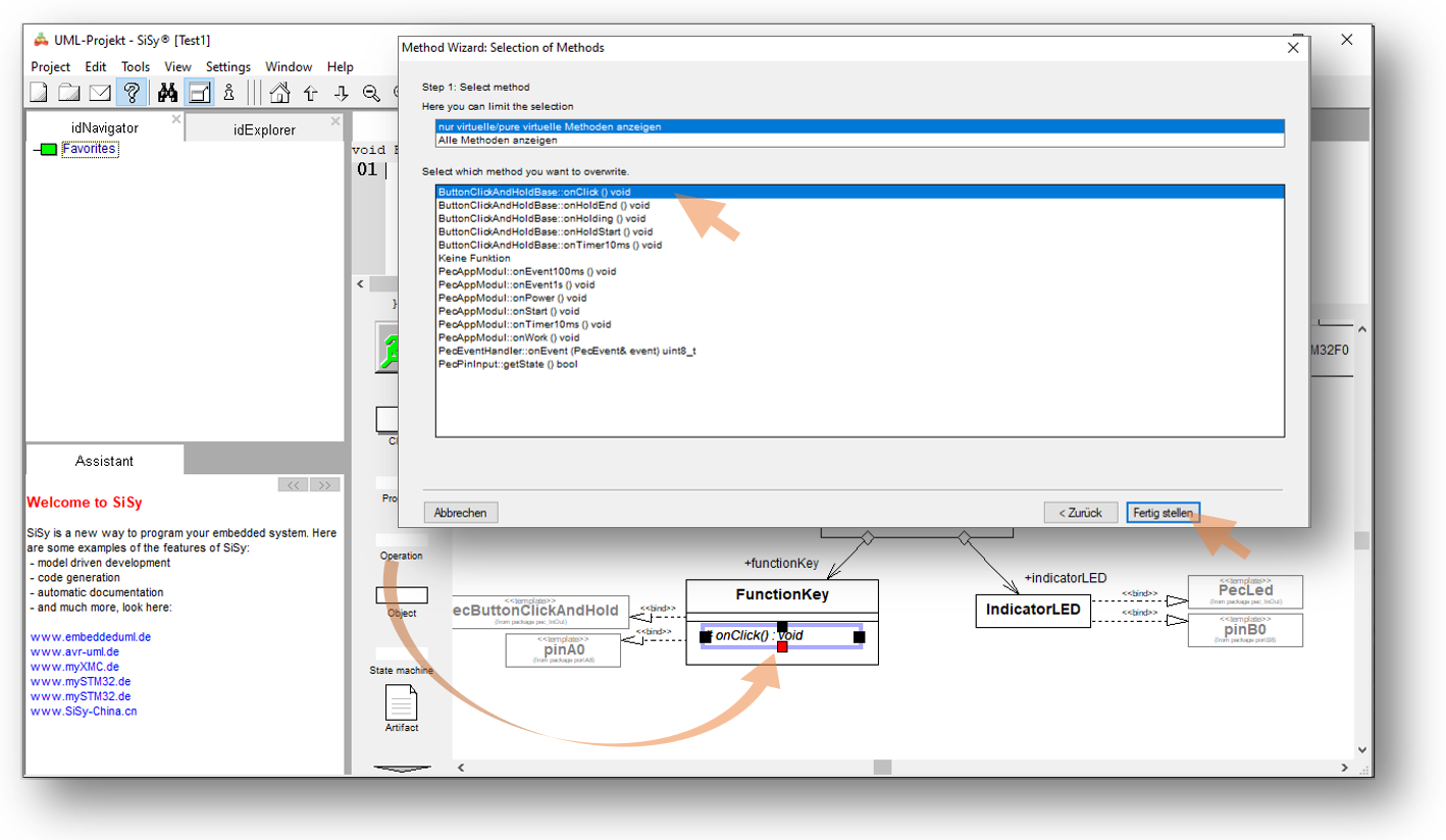 Im nächsten Schritt wollen wir uns an die Ereignisse onClick und onHoldStart hängen indem wir diese Verhaltensmerkmale überschreiben. Überschreiben bedeutet, dass in unserer Anwenderklasse Operationen gleichen Namens enthalten sind. Der Compiler erkennt automatisch, dass beim Aufruf dieser Ereignisse nicht die Operationen des PEC-Bausteins in der Bibliothek sondern die Operationen in unserer Anwendung aufgerufen werden müssen. Gehen Sie wie folgt vor: