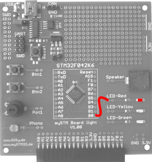 Nutzen sie die Schaltflächen Kompilieren, Linken und Brennen. Stellen Sie die nötigen Verbindungen auf dem Board mit den dafür vorgesehenen Patchkabeln her. Testen Sie die Anwendung.