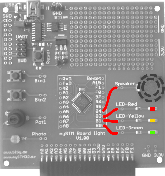 Entwickeln Sie dafür eine Lösung bei der die verschiedenen SysTick Ereignisse (10 ms, 100 ms, 1s) des Mikrocontrollers durch unterschiedliches blinken von LEDs und einem Signalton des Speakers verdeutlicht werden. Die LEDs soll an die Pins B0, B1, B3 und der Speaker an Pin B4 angeschlossen werden.