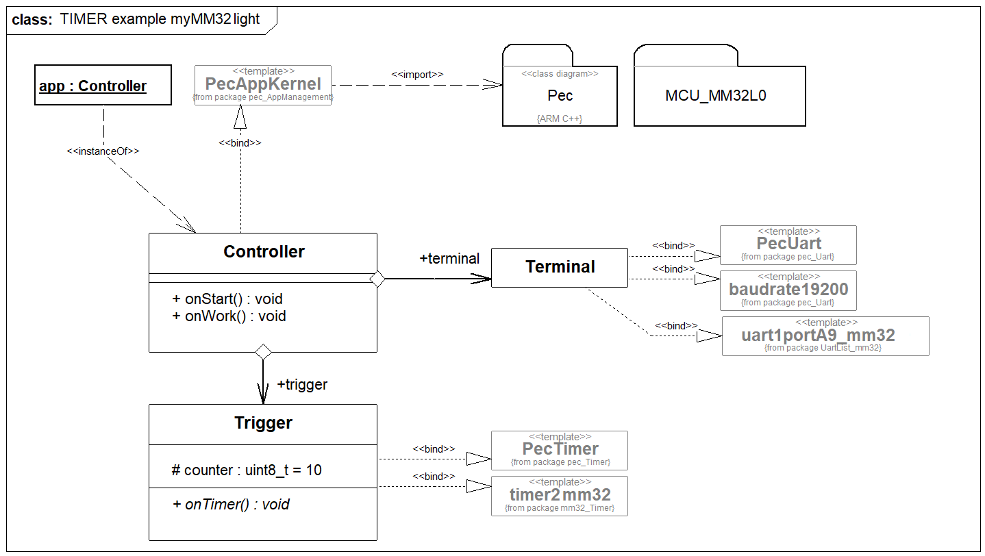 Die Klasse Controller hat einen Trigger und ein Terminal. Der Trigger ist ein PecTimer. Das Terminal ist eine PecUart mit baudrate19200.