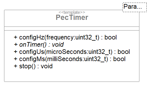 In der PEC-Bibliothek finden wir die Basisbaustein PecTimer. Er bietet neben einer virtuellen Operation onTimer() für die Behandlung des Timer-Interrupts (Eventhandler) auch verschiedene Alternativen für die Initialisierung des Timers configHz(), configMs(), configUs(). Damit wird dem entwickler die übliche Timer-Rechnerei mit Vorteilern Zählerwerten usw. so ziemlich abgenommen.