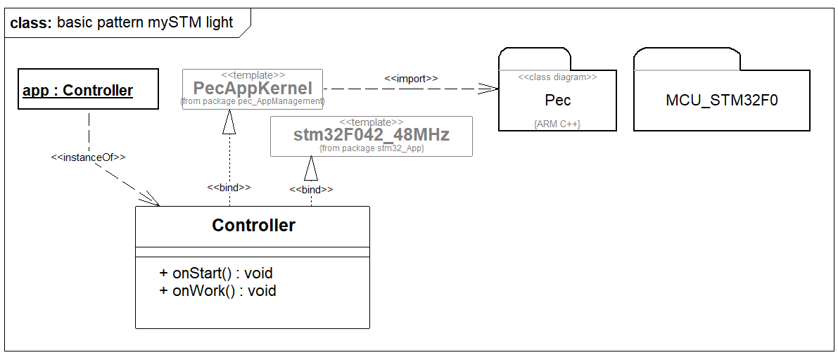 Die Realisierung sollte die im obigen Entwurf beschriebenen Elemente beinhalten. Zusätzlich müssen wir noch die konkret verwendeten Ressourcen unseres Controllers zuweisen. Vervollständigen Sie ihr Klassenmodell soweit, dass es mit der folgenden Darstellung übereinstimmt. Ordnen sie die Elemente übersichtlich an.