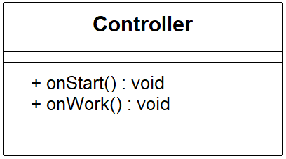 Im Zentrum steht der Systembaustein Controller. OK, das macht irgendwie Sinn. Wir wollen ja einen Mikrocontroller programmieren. Der Controller hat zwei Verhaltensmerkmale: Er kann gestartet werden onStart() und er kann arbeiten onWork().