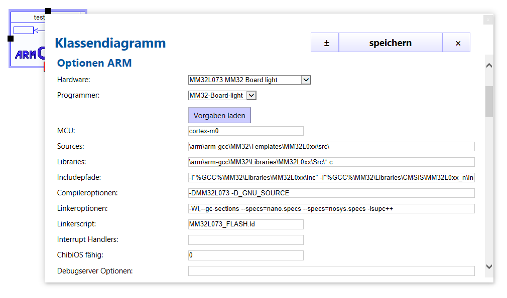 Legen Sie ein neues Klassendiagramm an, indem Sie das entsprechende Element per Drag&Drop aus der Objektbibliothek in das Diagrammfenster ziehen. Achten Sie auf die Einstellung der Zielsprache ARM C + + .