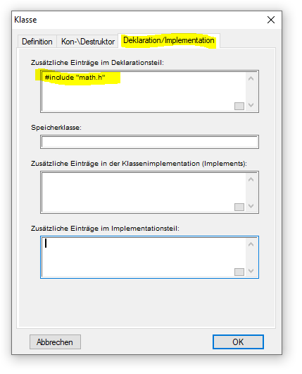 Mit der Formel POTENZ(X,Y) kann man in Excel den gewünschten Signalverlauf in 1000 Schritten gut experimentell ermitteln. Man kommt in etwa zu dem Ergebnis POTENZ(1,00693;Step). Die entsprechende C/C++ Funktion ist pow(x,y) und findet sich in der #include „math.h“. Dazu muss ein entsprechender Eintrag in der Klasse Controller vorgenommen werden. Selektieren Sie die Klasse Controller und wählen im Kontextmenü (rechte Maustaste) den Menüpunkt Definieren…. Im Dialog Deklarationen/Implementation ergänzen sie bitte folgende Zeile: