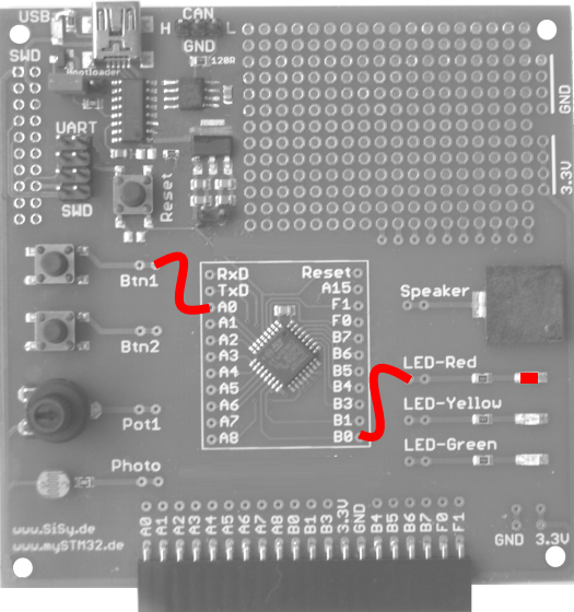 In der vorausgegangenen Übung haben wir einen Timer als internen Trigger genutzt. Bei eingebetteten Systemen ist kommt externen Auslösern jedoch mindest die selbe Bedeutung zu wie die Nutzung von Timern. Beispiele lassen sich endlos aufzählen, in einem Auto finden wir Schalter als Auslöser für Systemaktionen an allen Türen, der Heck- oder Kofferaumklappe, den Sicherheitsgurten, dem Beleuchtungssystem, Fensterheber, jede Menge Schalter für den Fahrer im Cockpitbereich und am Lenkrad usw. usw. All diese Schaltelemente schalten längst nicht mehr plump irgendetwas ein oder aus. Die Signale von diesen Systembausteinen werden von Mikrocontrollern verarbeitet. Das könnte man natürlich durch ständiges Abfragen (polling) der Schalter tun. Bei der großen Anzahl von auszuwertenden Signalen kann das doch schon erheblich Rechenzeit fressen die dann für andere Aufgaben nicht zur Verfügung steht. Damit kommt dem erkennen von Änderungen (steigende oder fallende Flanken) an den Signaleingängen und dem Auslösen und Verarbeiten von Hardware-Ereignissen also Interrupts große Bedeutung zu, denn ereignisorientierte Verarbeitung verbraucht signifikant weniger Rechenzeit und kann zusätzlich noch viel besser Prioritäten der Signal beachten.