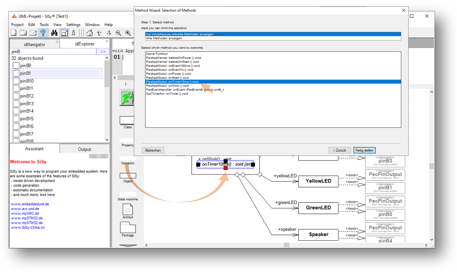 Im nächsten Schritt hängen wir uns an die Systemereignisse für 10, 100 und 1000 Millisekunden indem wir jeweils Operationen auf die Klasse Controller ziehen und Schritt für Schritt folgende Funktionen zur Ereignisbehandlung einfügen: