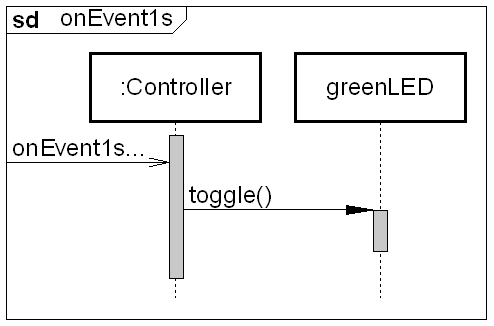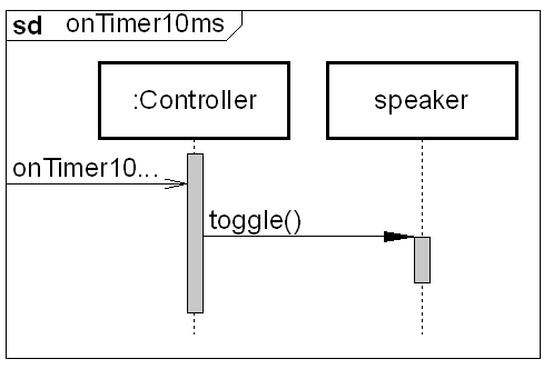 Zunächst zum 10 Millisekunden Ereignis. Dieses Ereignis wird direkt aus der Interruptfunktion (Interrupt Service Routine oder auch Interrupt Handler) aufgerufen. Für den Anwendungsentwickler bedeutet das diese Funktion nur im Ausnahmefall und wenn dann nur mit sehr wenig also schnellem Code zu benutzen, da wir sonst das System ausbremsen. Dass es sich um ein Ereignis handelt erkennen wir an dem Präfix on bei der Operation onTimer10ms(). Die 10 Millisekunden sind viel zu schnell um es als blinkende LED wahrzunehmen. Deshalb legen wir das Signal auf den Speaker denn hören können wir Frequenzen bis weit in den Kilohertz-Bereich.